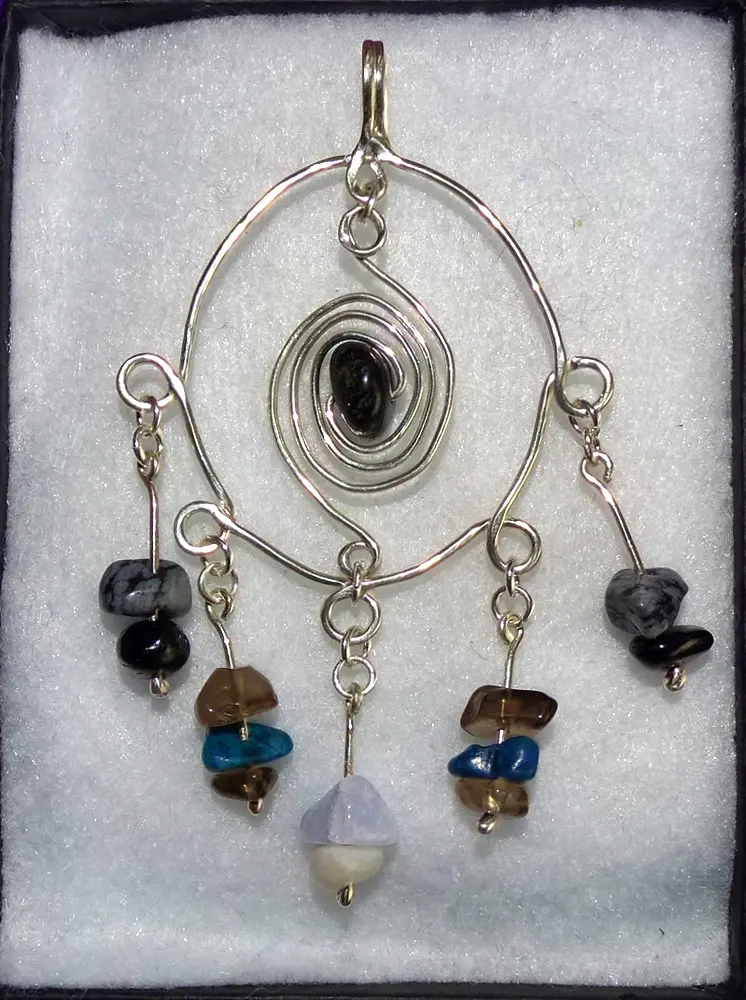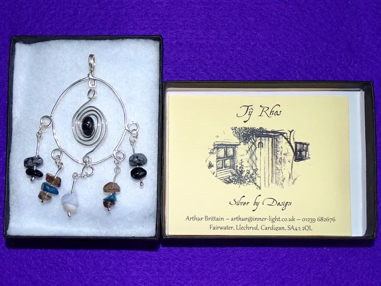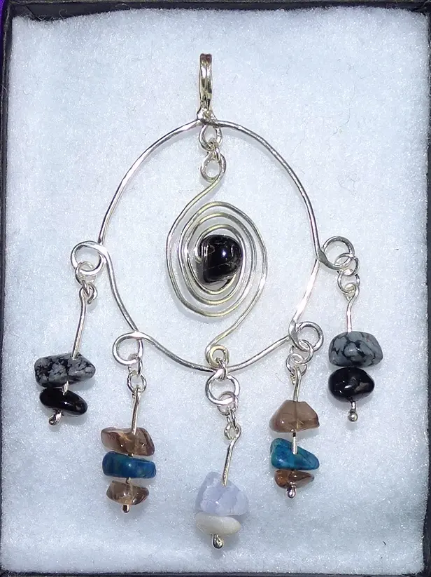 This elegant 7 x 4 cm pendant has been designed to help clear and calm the mind, with emphasis on the base and throat chakras, the Body and the Emotions. It has been made using 3.3grams of Sterling silver, set with 4 pieces of Smoky Quartz, 3 pieces of Black Tourmaline, 2 pieces each of Blue Chrysocolla and Snowflake Obsidian, and 1 piece each of Blue Lace Agate and Snow Quartz; and is finished with a heart-spiral of silver.