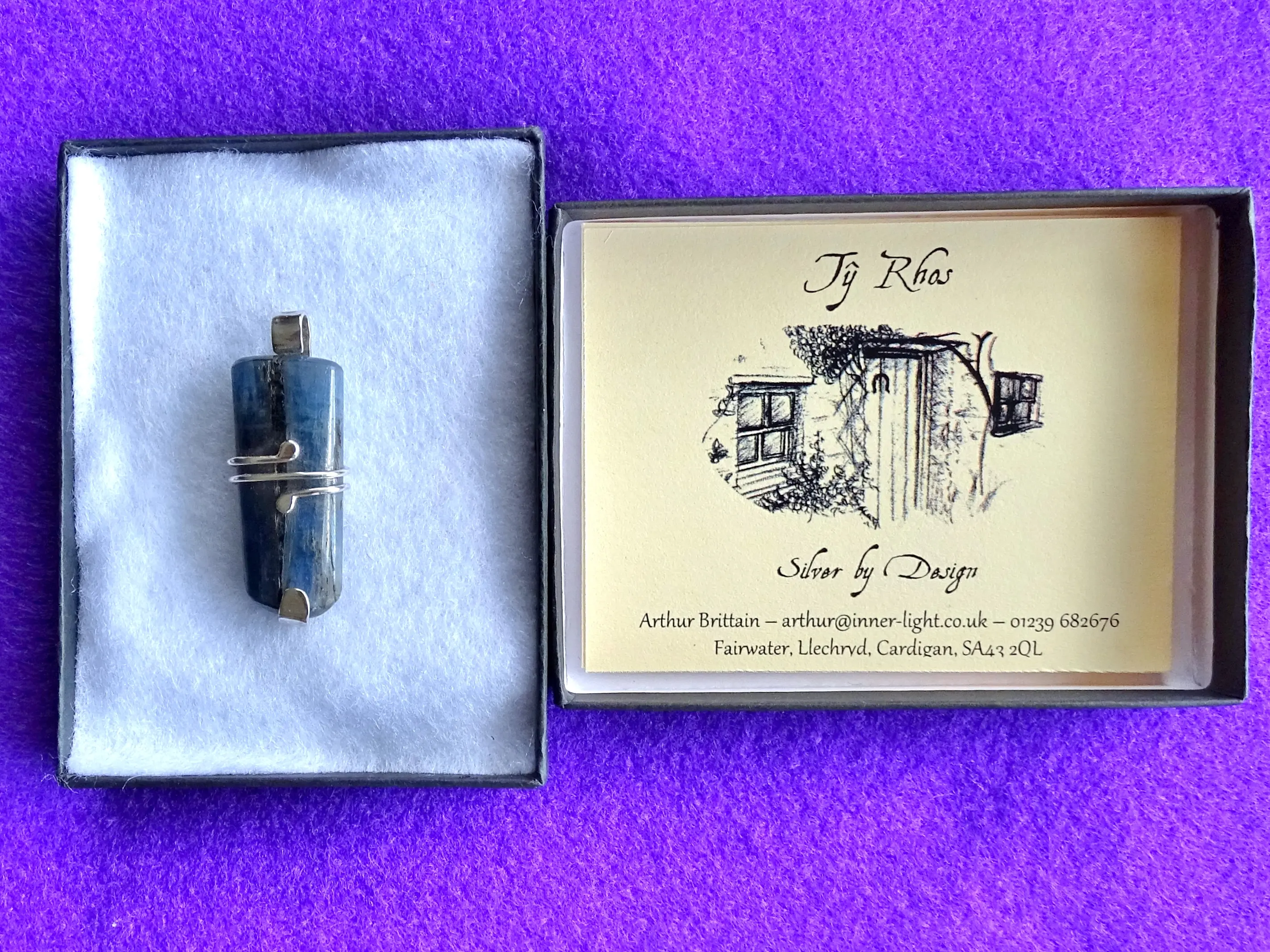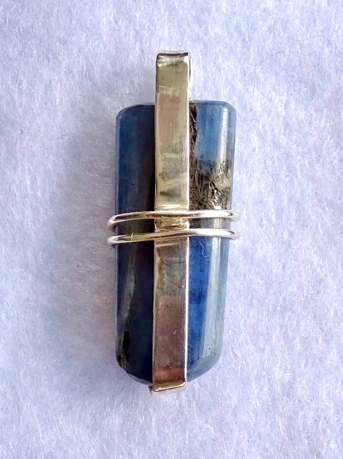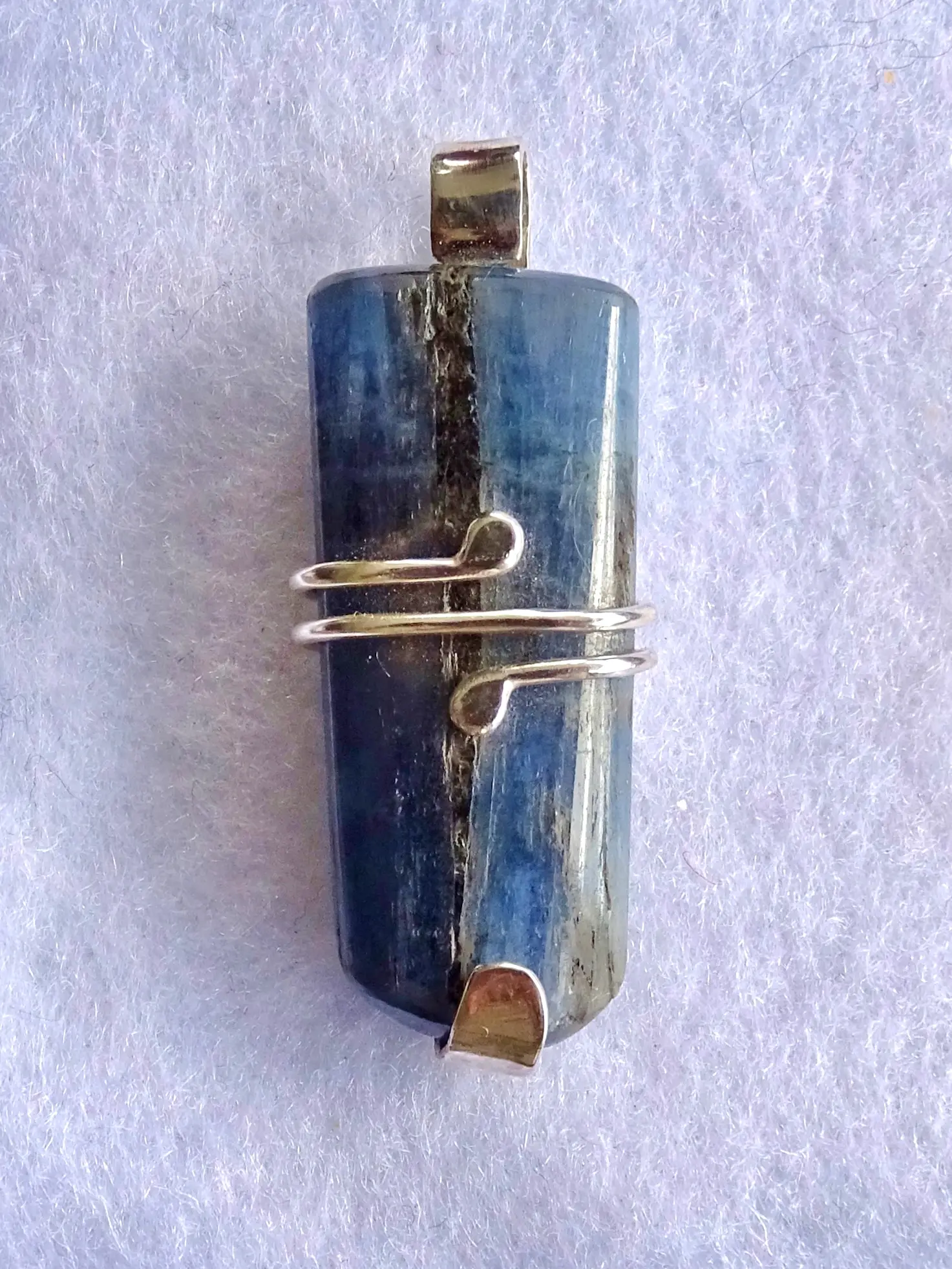This wonderful 4 cm long Indigo Kyanite pendant is set in 2.8 grams of sterling silver. The 48 carat highly-polished bladed crystal has its curved base and back supported by a long tongue of silver, which extends above the crystal to form a sturdy loop through which the wearer may thread a chain or thong. A sturdy silver wire with hammered ‘snake-head’ ends winds twice around the centre of the crystal, holding it in a secure embrace without obscuring the beauty within.