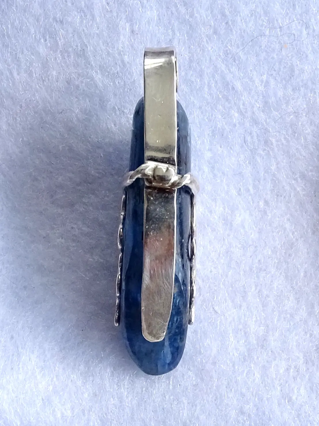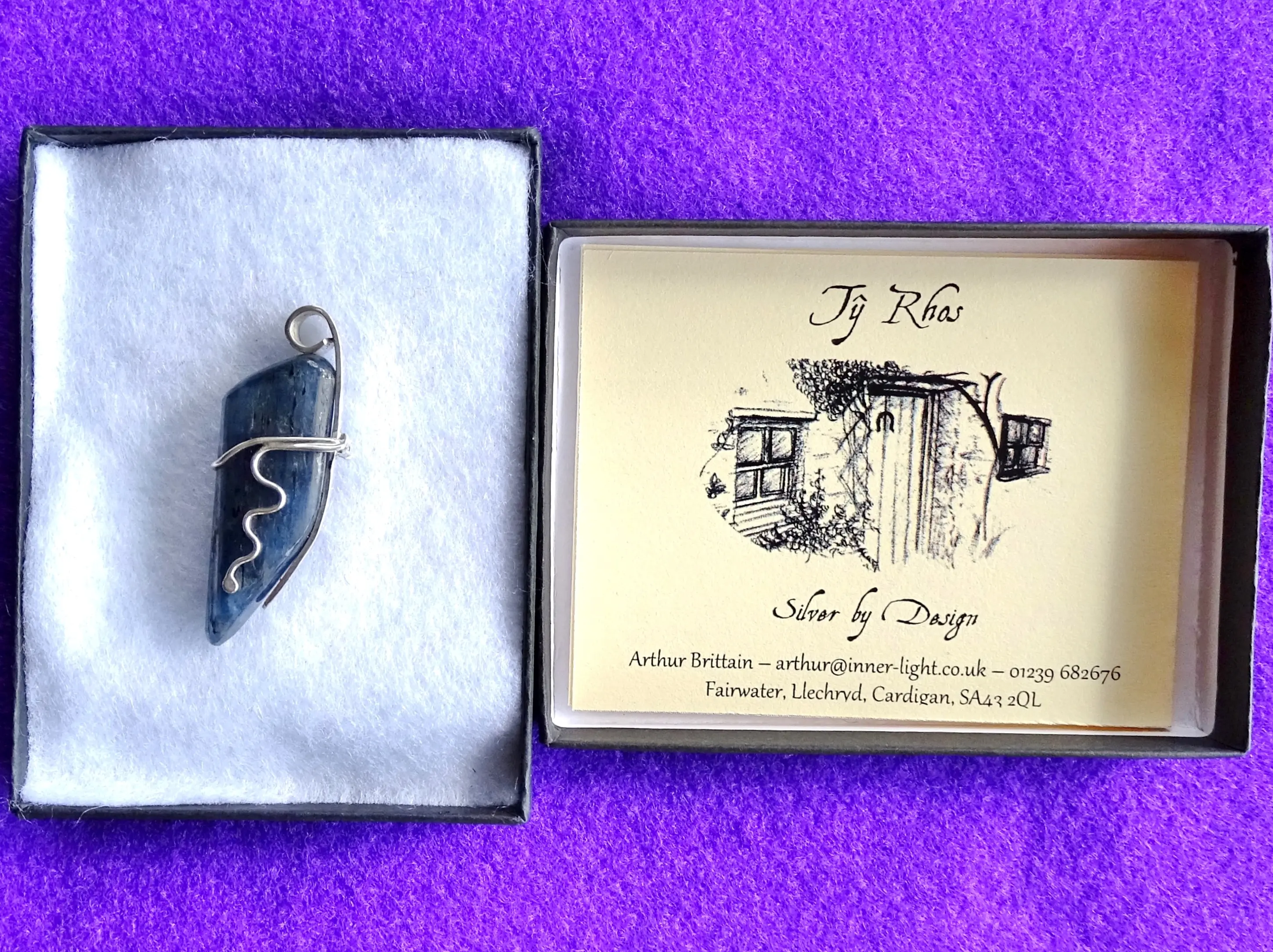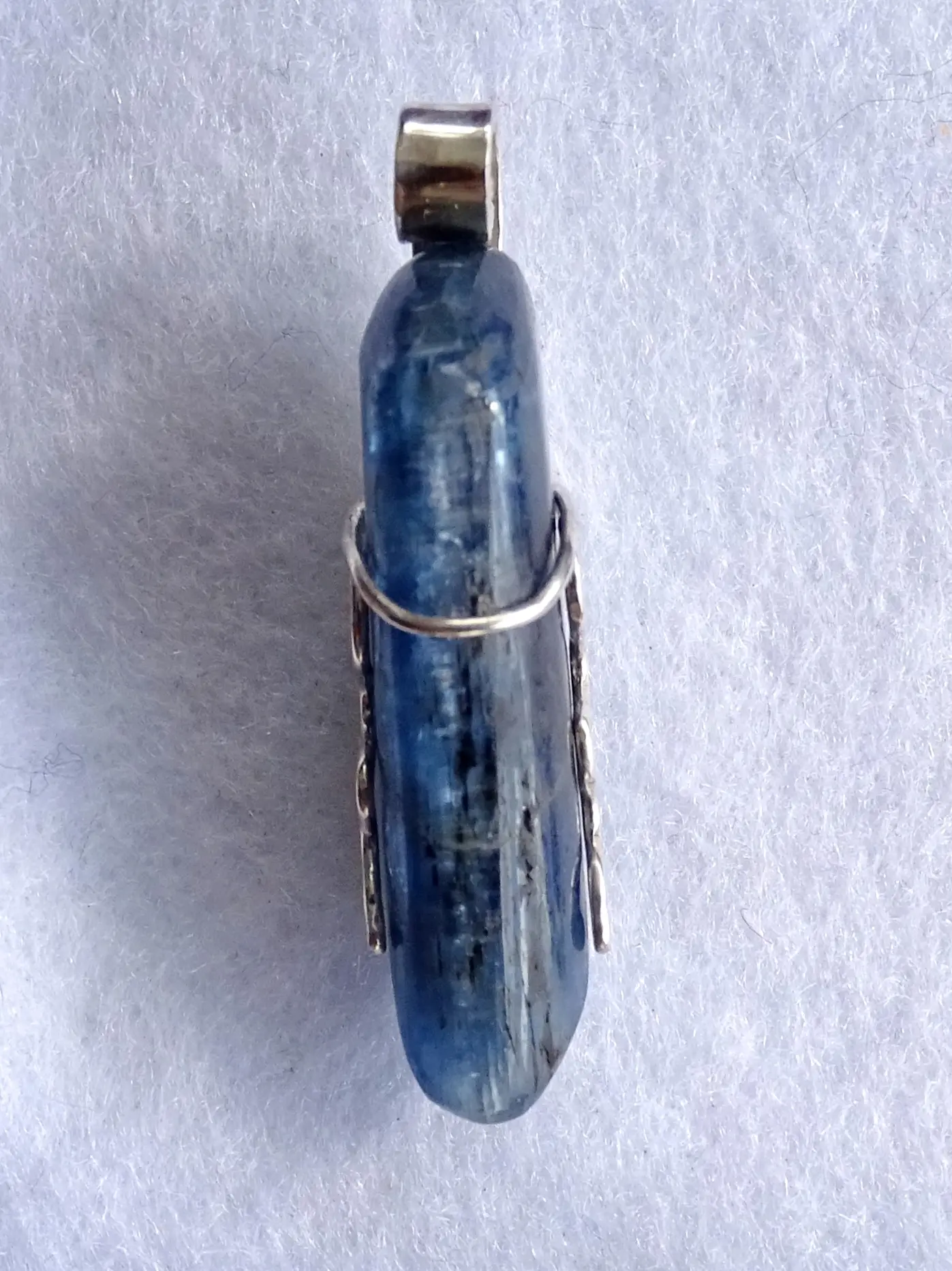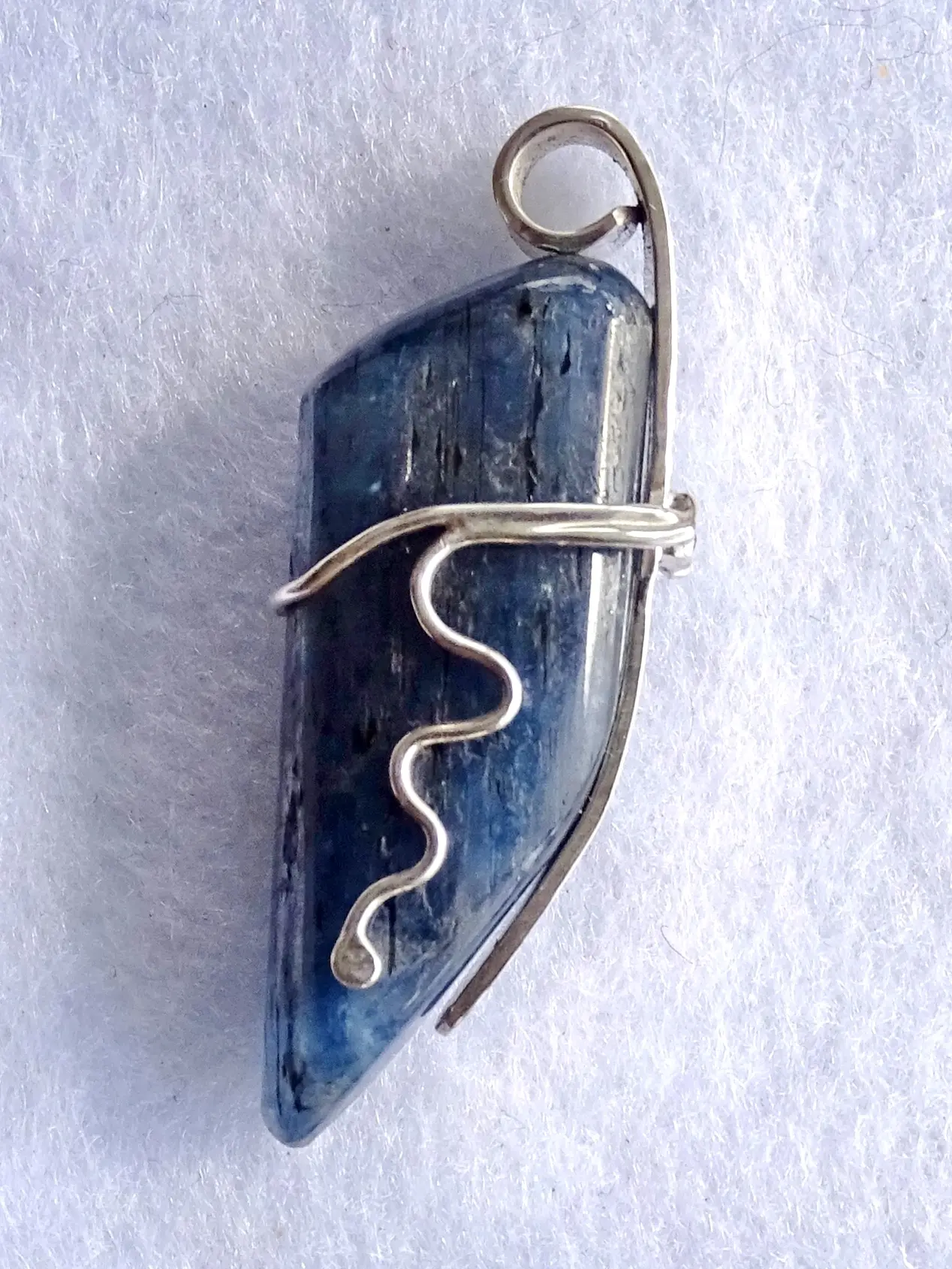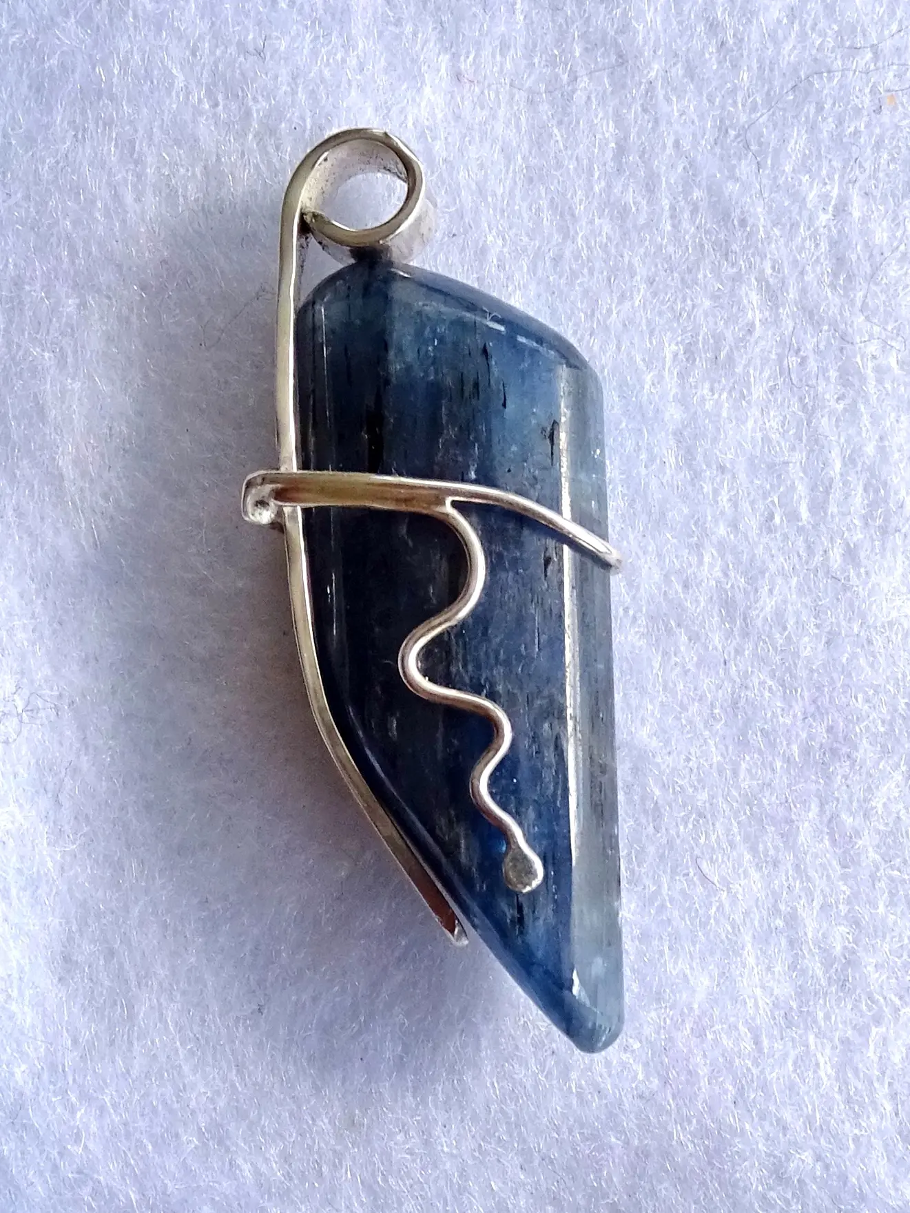 This powerful 4 cm long Indigo Kyanite pendant is set in 2.5 grams of sterling silver. The 47 carat highly-polished bladed crystal is held in an unusual orientation with the narrowest side facing out from the body to keep it as ‘natural’ as possible. The back of the crystal is supported by a curving tongue of silver, which extends above the crystal to form a sturdy loop through which the wearer may thread a chain or thong. The broad sides of the crystal are both embellished with a ‘snake’ of silver wire, whose hammered ends and sinuous curves serve to hold the bladed crystal securely in place. The Kyanite has a good clarity and a fine deep colour, its striated structure aligning perfectly with the vertical orientation of the pendant.
