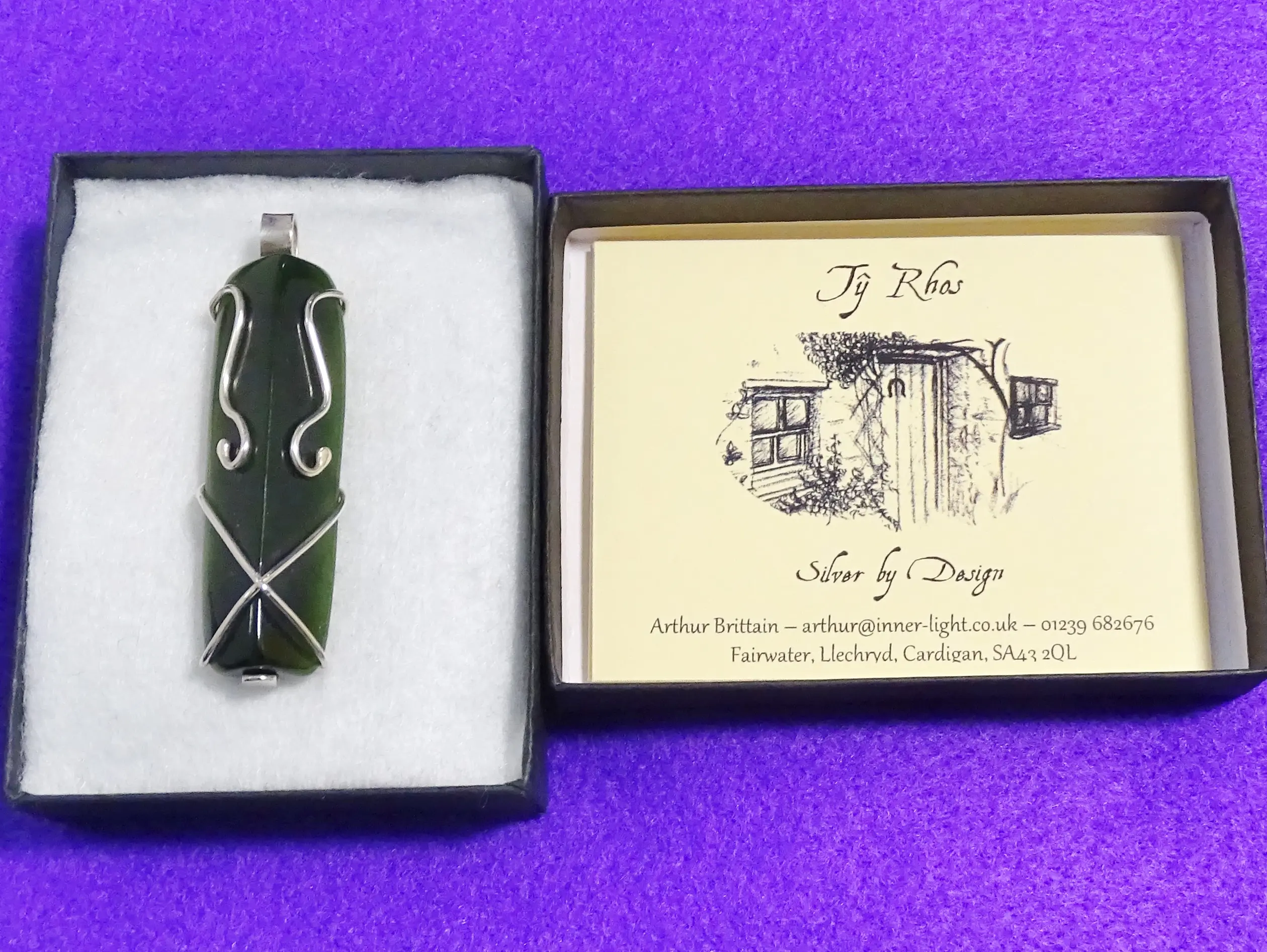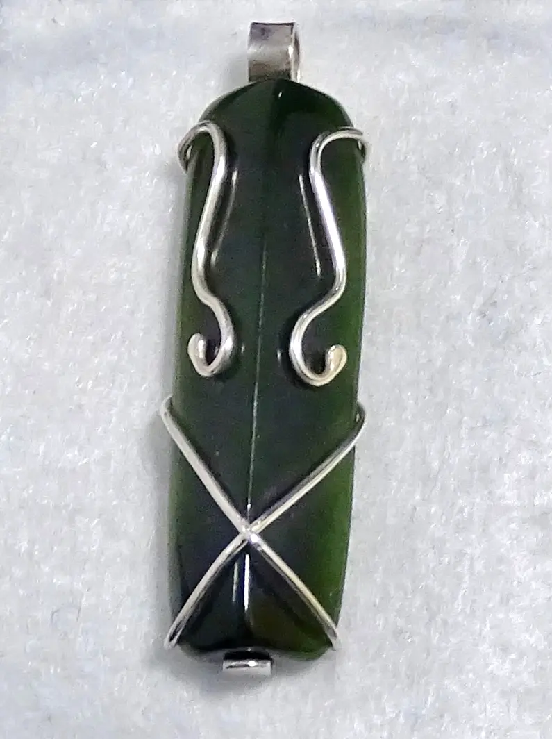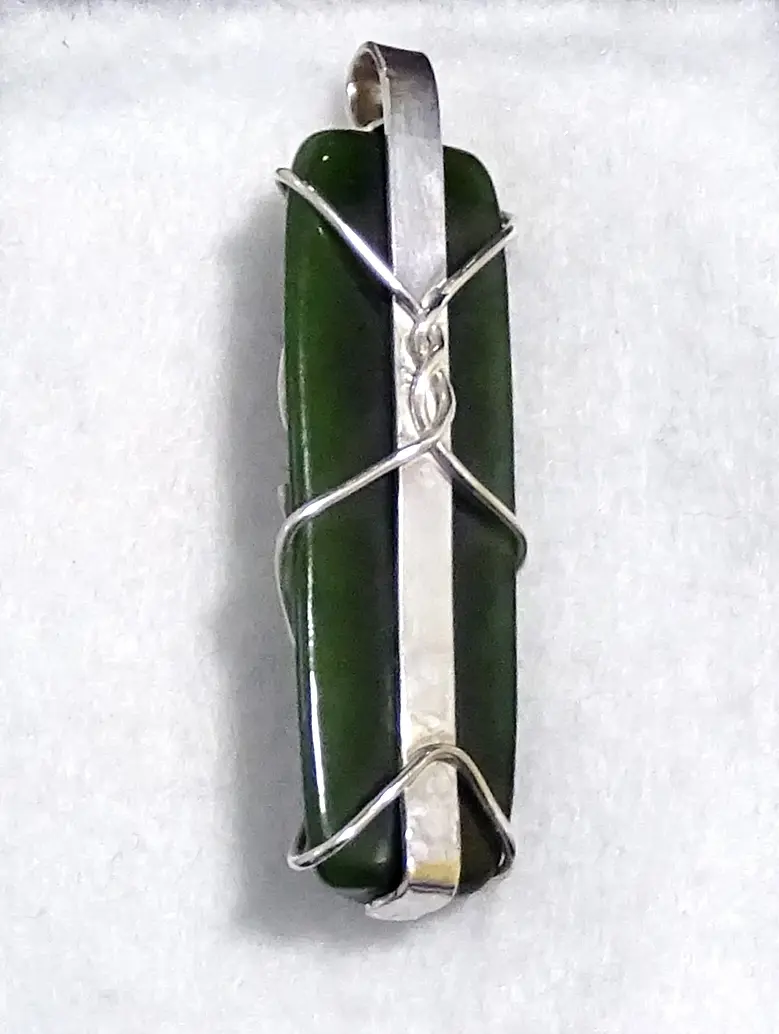 This striking 6.1 cm long Nephrite Jade pendant is set in 4.7 grams of sterling silver. The 70 carat 3-sided pillar of Jade has gently rounded edges, and has been polished to reveal its deep-green colour and sheen. The widest side of the pillar lies next to the body, and is supported by a long tongue of silver that curves around its base and extends above it to form a sturdy loop through which the wearer may thread a chain or thong. A long looping wire of silver forms a supportive ‘X’ near the base of the pillar, before twisting into a helix at the back and curving up and over the shoulders of the pillar to finish with hammered ‘snake-head’ ends at the front.