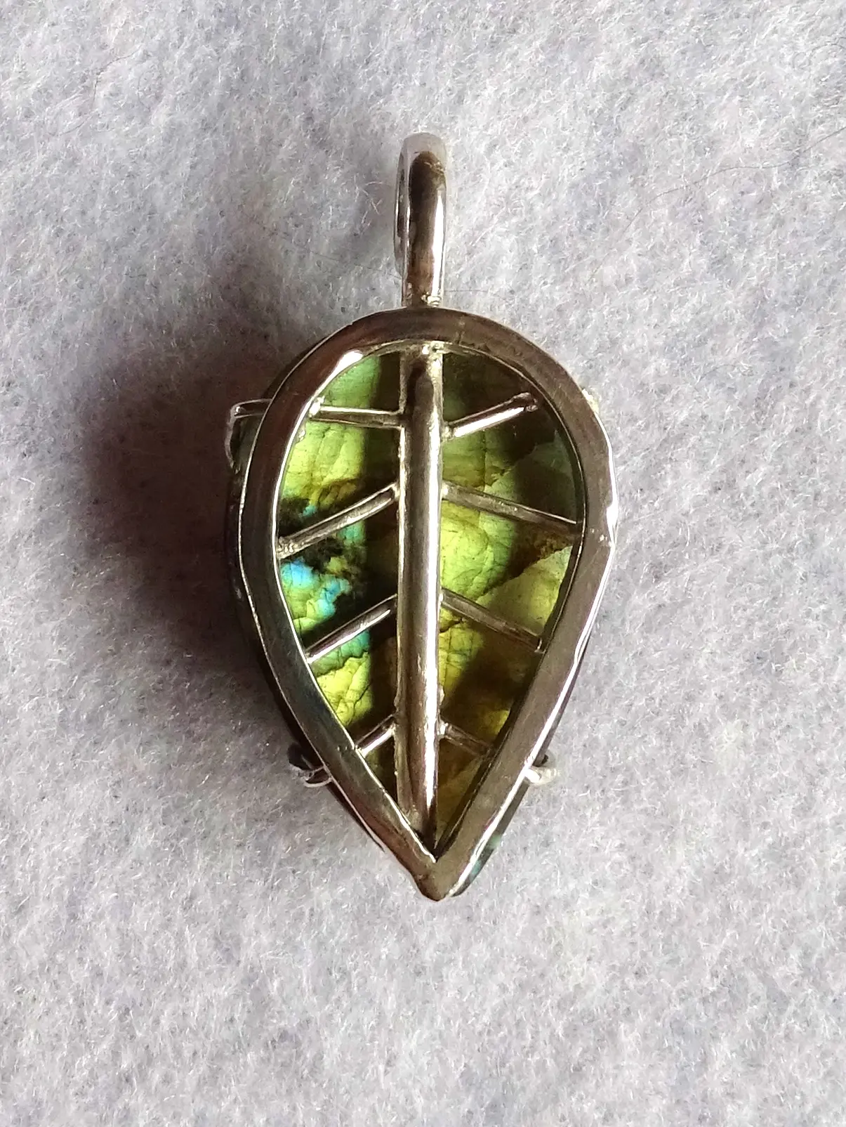 From the very start this cabochon called itself ‘leaf’, and insisted on the somewhat complex nature of its setting! The concept of the season of Autumn – of a life fully experienced and well-lived giving way to a quieter time of contemplation and review as we grow older in years – was also emphasised, encouraging us not only to value what we learn as we move through life, but also to value those who, through age and experience, have gained the Wisdom to teach and Guide those who follow. Leaf also held the Gold colouring of the Labradorite to be important to the finished pendant, saying: ‘...through The Gold Ray that simply IS, the Gold I hold defines, builds, shapes and supports all that is Created: it is everywhere and throughout all the Dimensions and Planes of Reality... it is the warp and weft of the great tapestry of your Life, allowing the spiritual threads of your existences to create magnificent images upon it and telling the stories of your lives...’