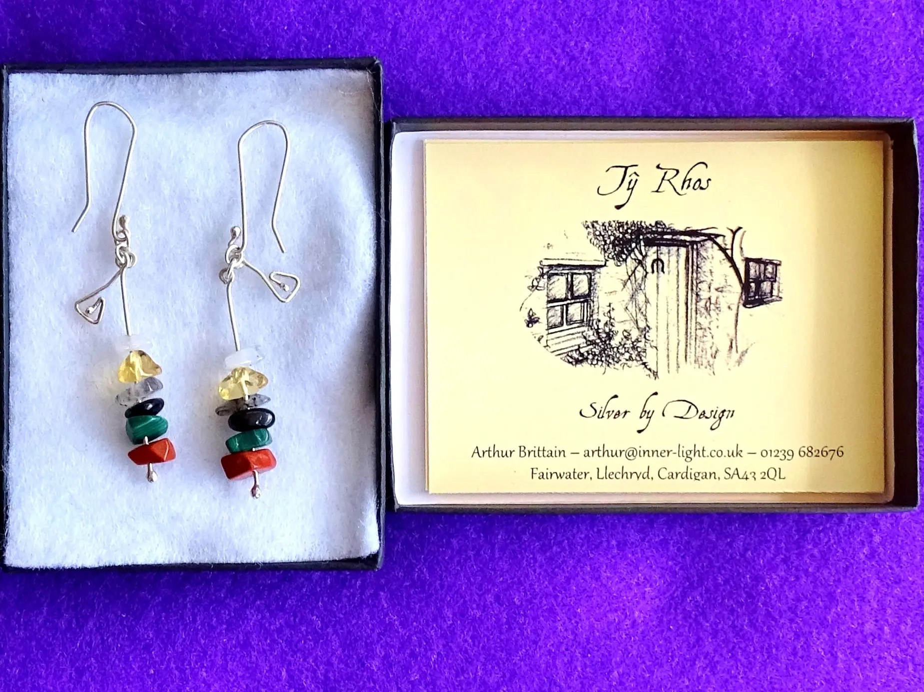 These earrings have been designed to help promote Spiritual expansion through the heart, with emphasis on the base, heart, crown and soul star chakras; the Soul and the Spirit. They have been made using 32cm (1.7 grams) of Sterling silver, set with 4 pieces each of Rutilated Quartz and Amethyst, and 2 pieces each of Moldavite and Snow Quartz; and are finished with heart spirals of silver. The heart spirals and crystals have been symmetrically balanced and aligned to enable the left/right sides of the brain to function harmoniously.