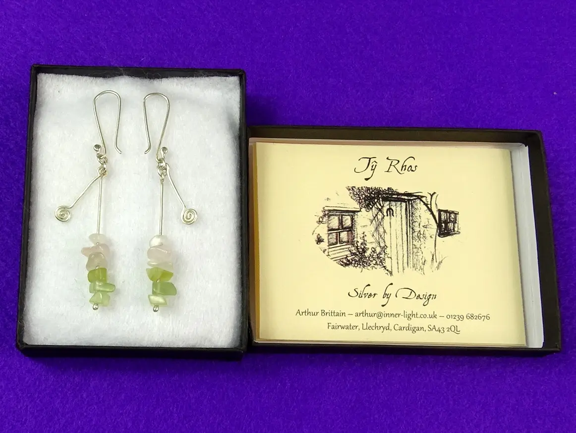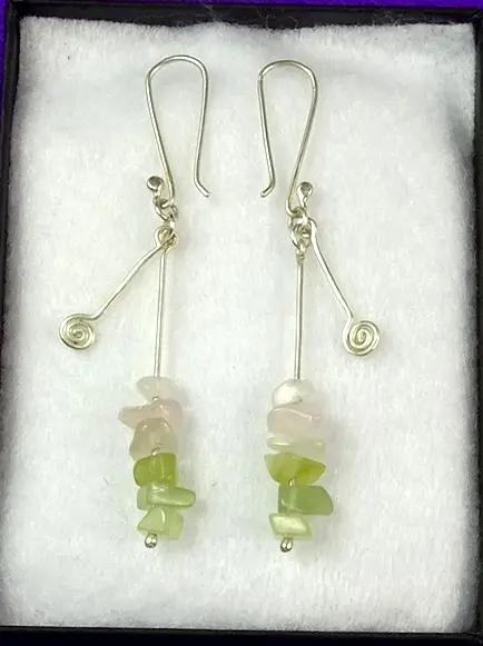 These earrings have been designed to promote emotional balance, with emphasis on the heart and sacral chakras, the Soul and the Emotions. They have been made using 30cm (1.6 grams) of Sterling silver, set with 6 pieces of Jadeite, 4 pieces of White Moonstone, and 2 pieces of Rose Quartz; and are finished with tightly coiled spirals of silver. The spirals and crystals have been symmetrically balanced and aligned to enable the left/right sides of the brain to function harmoniously.