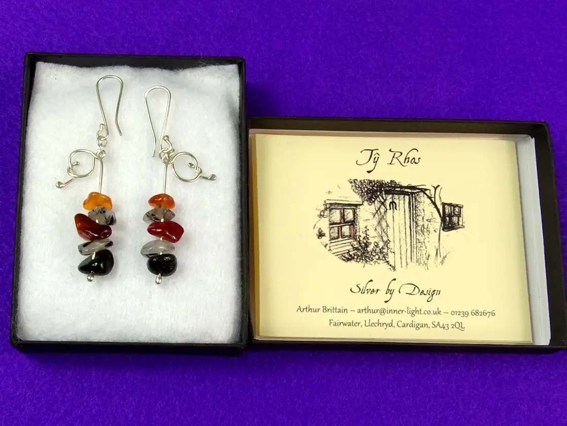 These earrings have been designed to promote a strong aura and Energy Body, with emphasis on the base and sacral chakras, and the Body and the Emotions. They have been made using 32cm (1.7 grams) of Sterling silver, set with 4 pieces each of Tourmalinated Quartz and Carnelian, and 2 pieces of Black Tourmaline; and are finished with a ‘double-headed’ locked loop of silver. The loops and crystals have been symmetrically balanced and aligned to enable the left/right sides of the brain to function harmoniously.