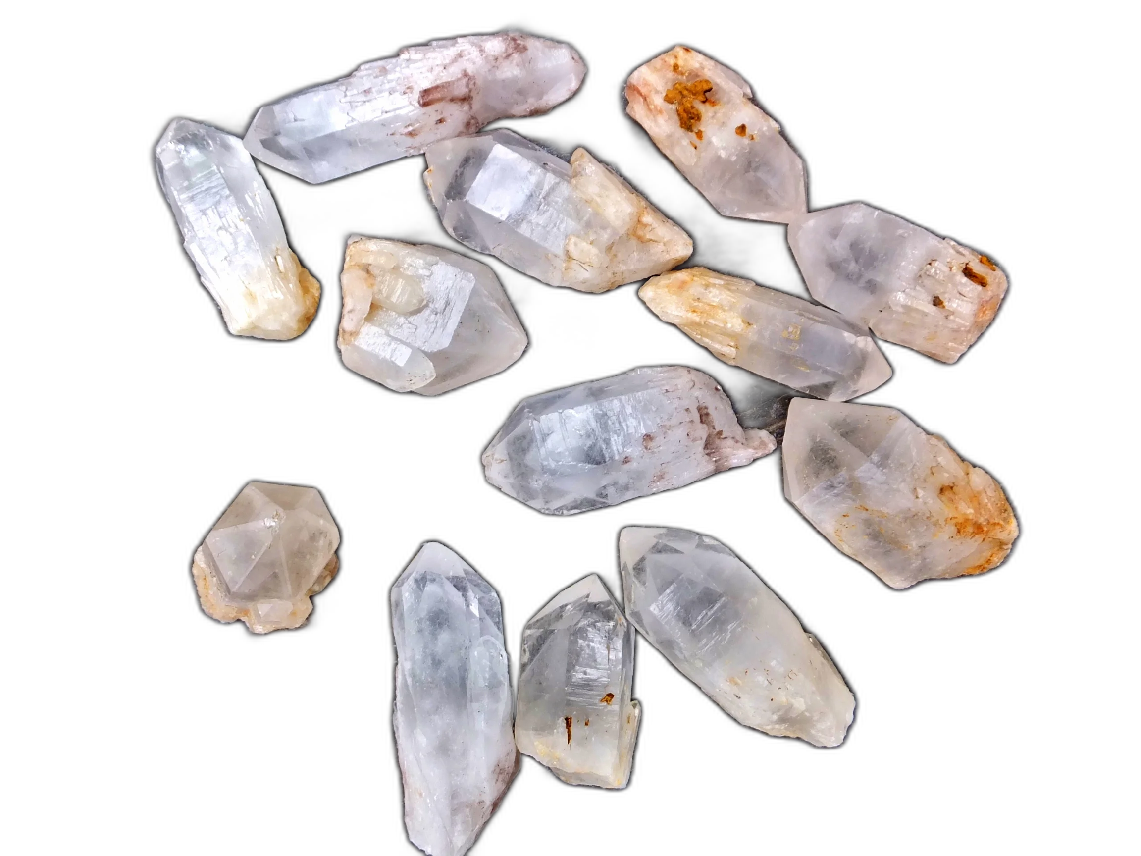 Picture shows EXAMPLES of our stock of A grade Inner Light Quartz crystals. These have candle (celestial) quartz markings to their exterior, and extremely clear well-defined manifestor crystals within. You will receive one of minimum weight 5 grms