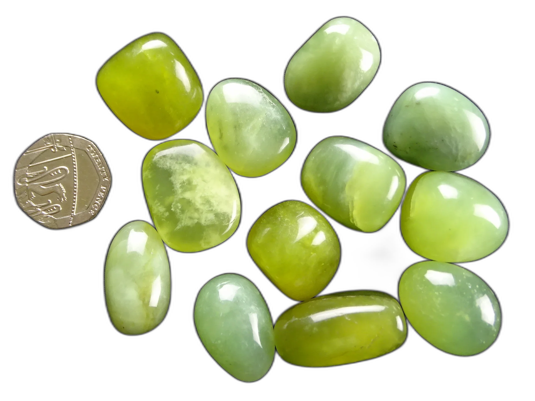 Picture shows EXAMPLES of our stock of Bowenite Jade tumbled stones. You will receive one of average weight 8 grams.