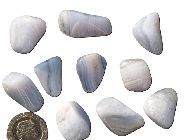 Picture shows EXAMPLES of our stock of Blue Lace Agate tumbled stones: these have a little less colour and gloss than the A and AA grades. You will receive one of minimum weight 5 grams.