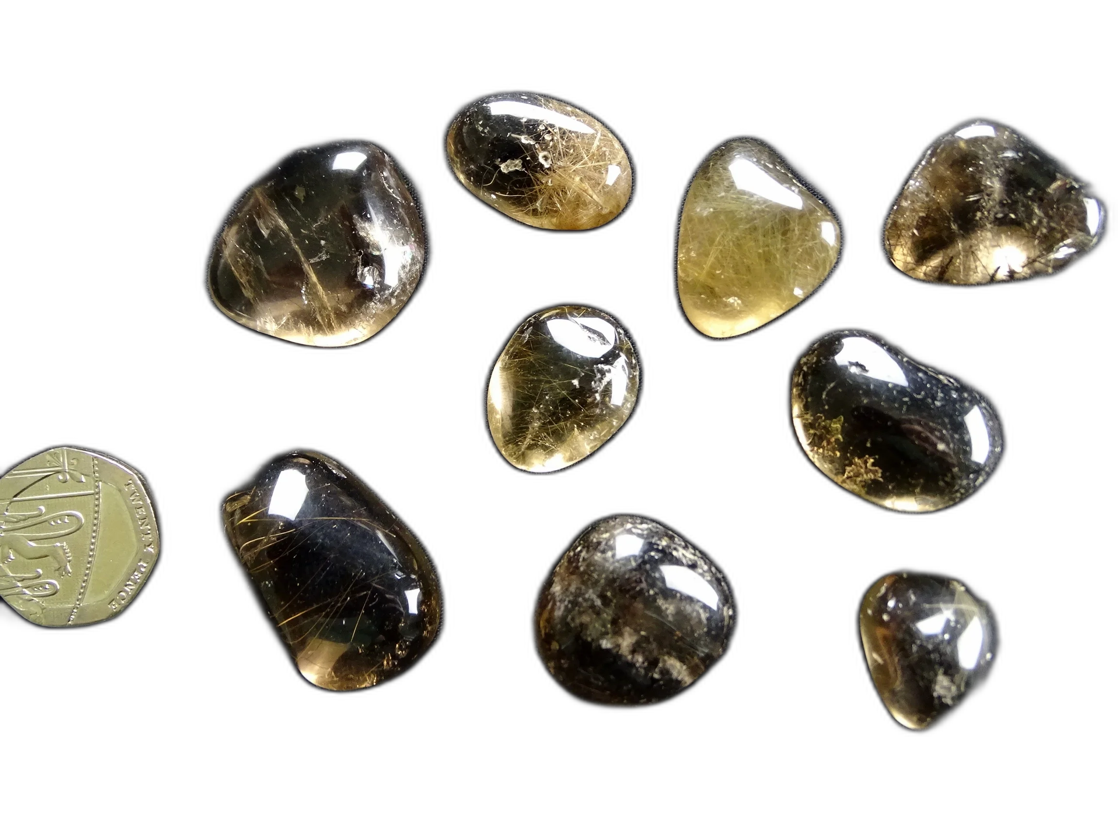 Picture shows EXAMPLES of our stock of natural Smoky Quartz included tumbled stones. You will receive one (chosen at random) of average weight 8 grams. Inclusions will be either rutile or tourmaline, or a combination of both.