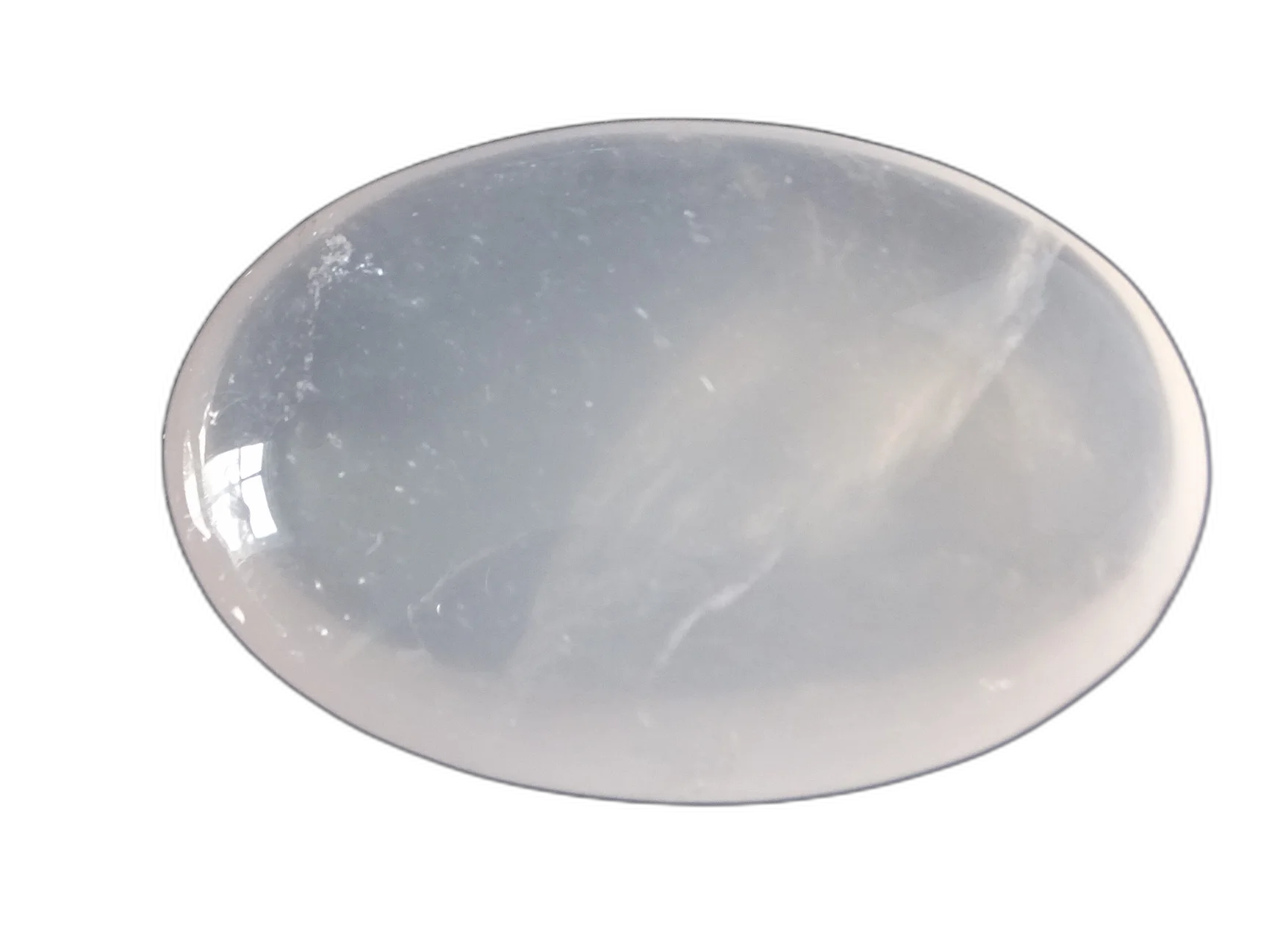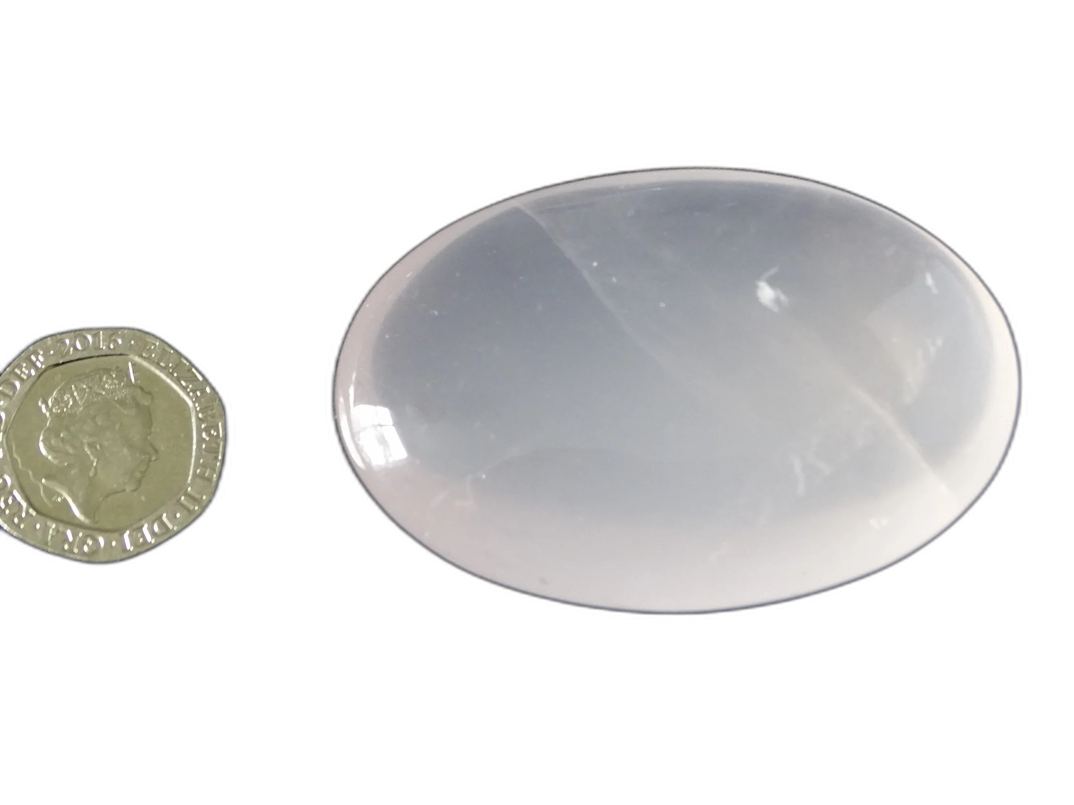 Very pretty translucent pink girasol soap-shaped palmstone with good clarity and some veiling.