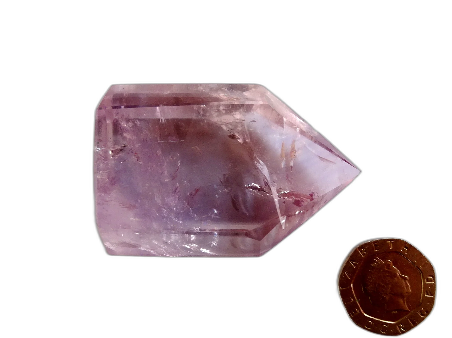 This is a pretty piece of natural Brazilian Amethyst that has been cut and polished into a nicely symmetrical tabular generator point. The amethyst is a delicate lilac shade, with a very good clarity and some subtle areas of veiling.