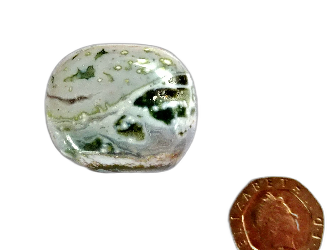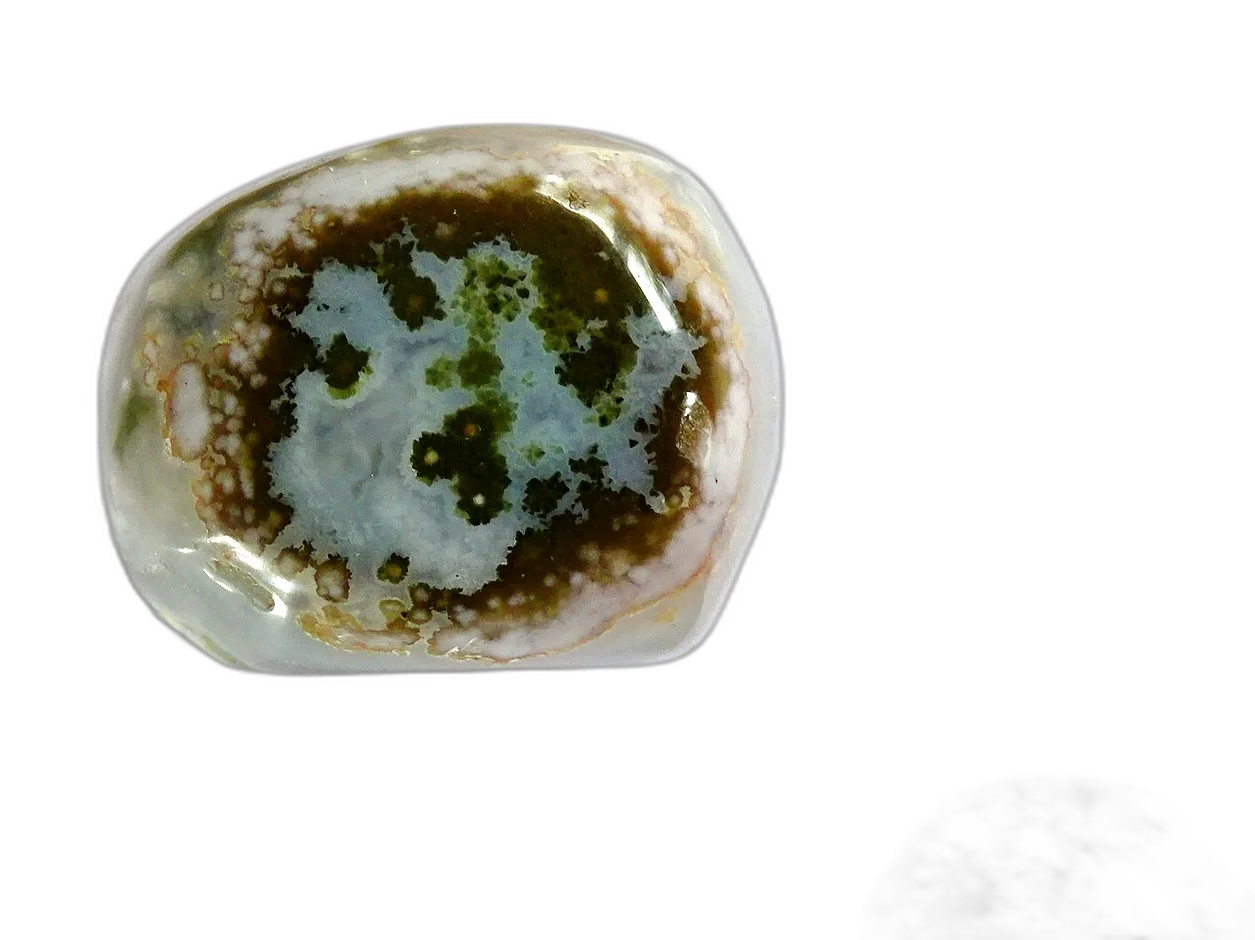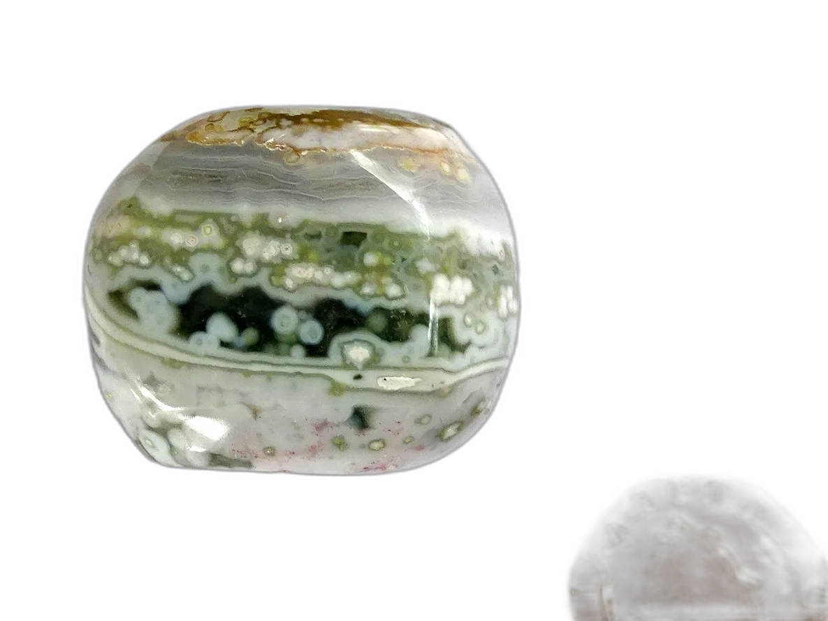 Pretty polished pebble of Ocean Jasper, in the rarest shades of white, green, grey and cream. Ocean Jasper is a stone of hope and unlimited ecstasy and courage. It clears, cleanses and lifts the spirits and is a breath of fresh air for the heart, leaving a sense of positivity and gratitude in its wake.