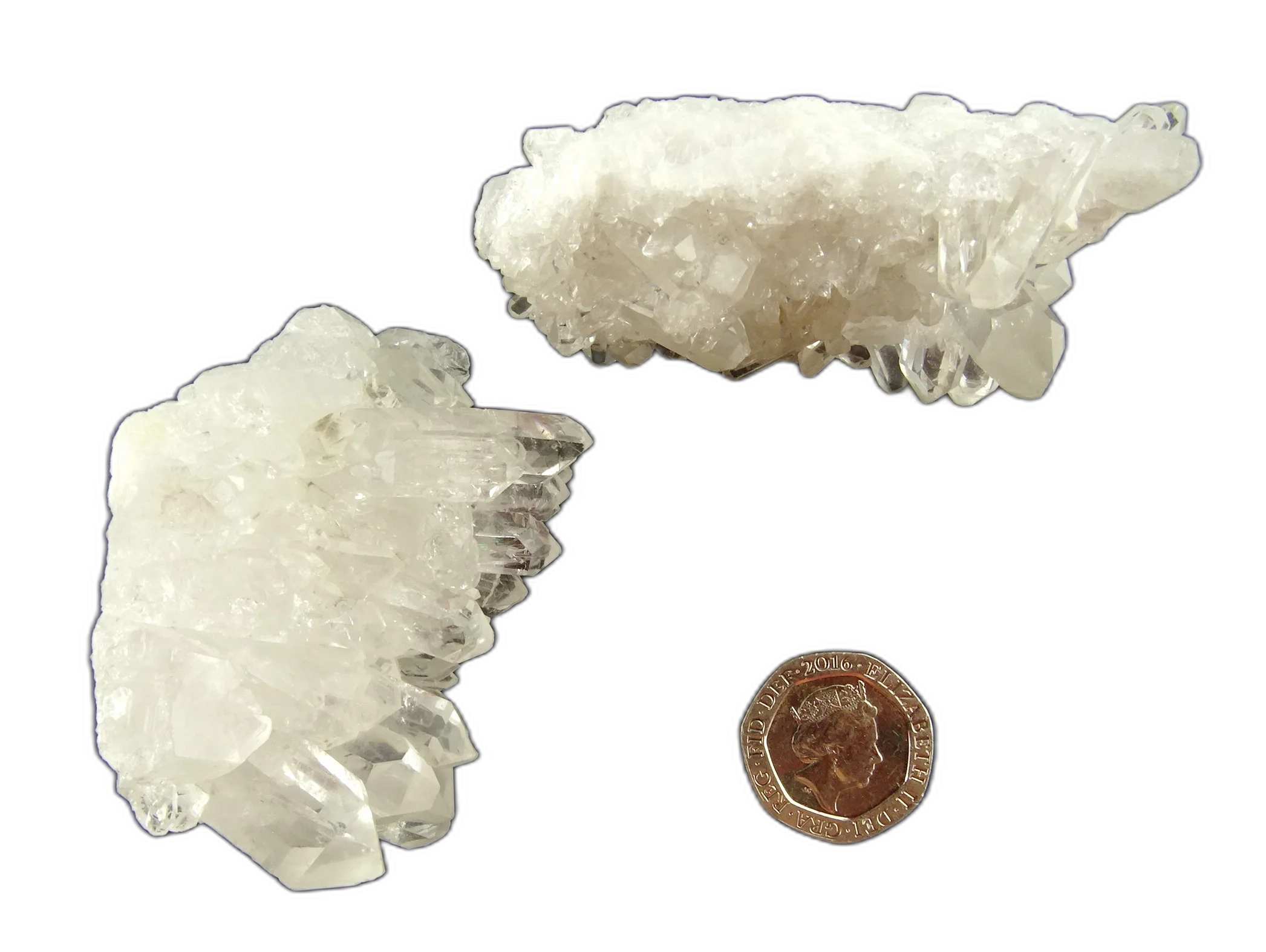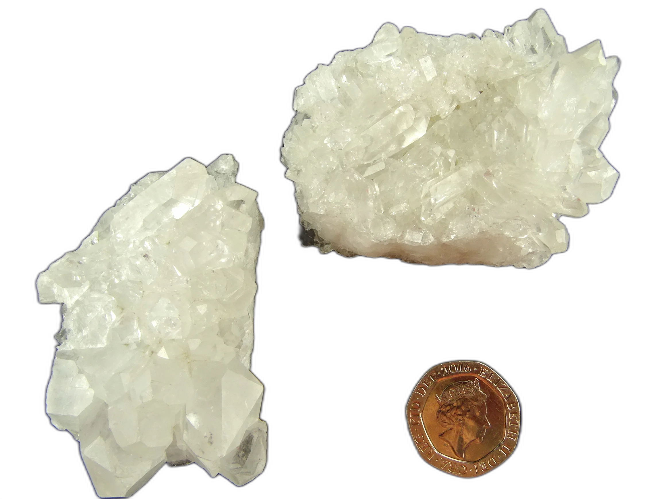 Pair of clusters of Clear Quartz. Nice clear crystals, one cluster sitting on a thin layer of quartzite groundmass; the other sitting on a layer of crystals, many terminated. Useful for charging water filter jugs - one week on; one week off to recharge in sunlight, swapping them out; or for gridding or charging small spaces.